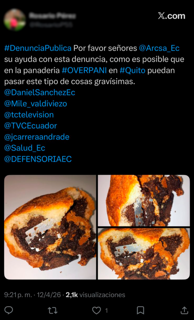 Tras denuncias ciudadanas recibidas a través de redes sociales sobre la presencia de una cuchilla de afeitar dentro de un pan, la Agencia Nacional de Regulación, Control y Vigilancia Sanitaria (Arcsa) ejecutó de inmediato inspecciones en panaderías ubicadas en los sectores de Carapungo y San Carlos, al norte de Quito, donde se pudieron evidenciar graves condiciones higiénicas que representan un serio riesgo para la salud de la población.