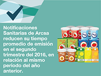 En el período de junio a agosto del 2015 se emitieron 3.284 Notificaciones Sanitarias de Alimentos a nivel nacional en un promedio de 35 días, mientras que en el mismo período de este año se realizaron 3.245 notificaciones sanitarias en 15 días; esto representa una reducción del 43% en tiempos de emisión de notificaciones. Para empresas que cuentan con certificación BPM, el trámite se reduce a 3 días laborables ya que no requieren Notificación Sanitaria, solamente la inscripción del producto. De esta forma, Arcsa garantiza una reducción de tiempo en su gestión, haciendo más eficaz y ágil el servicio para el usuario en la emisión de Notificaciones Sanitarias o Inscripción por línea de BPM de Productos Alimenticios Nacionales.